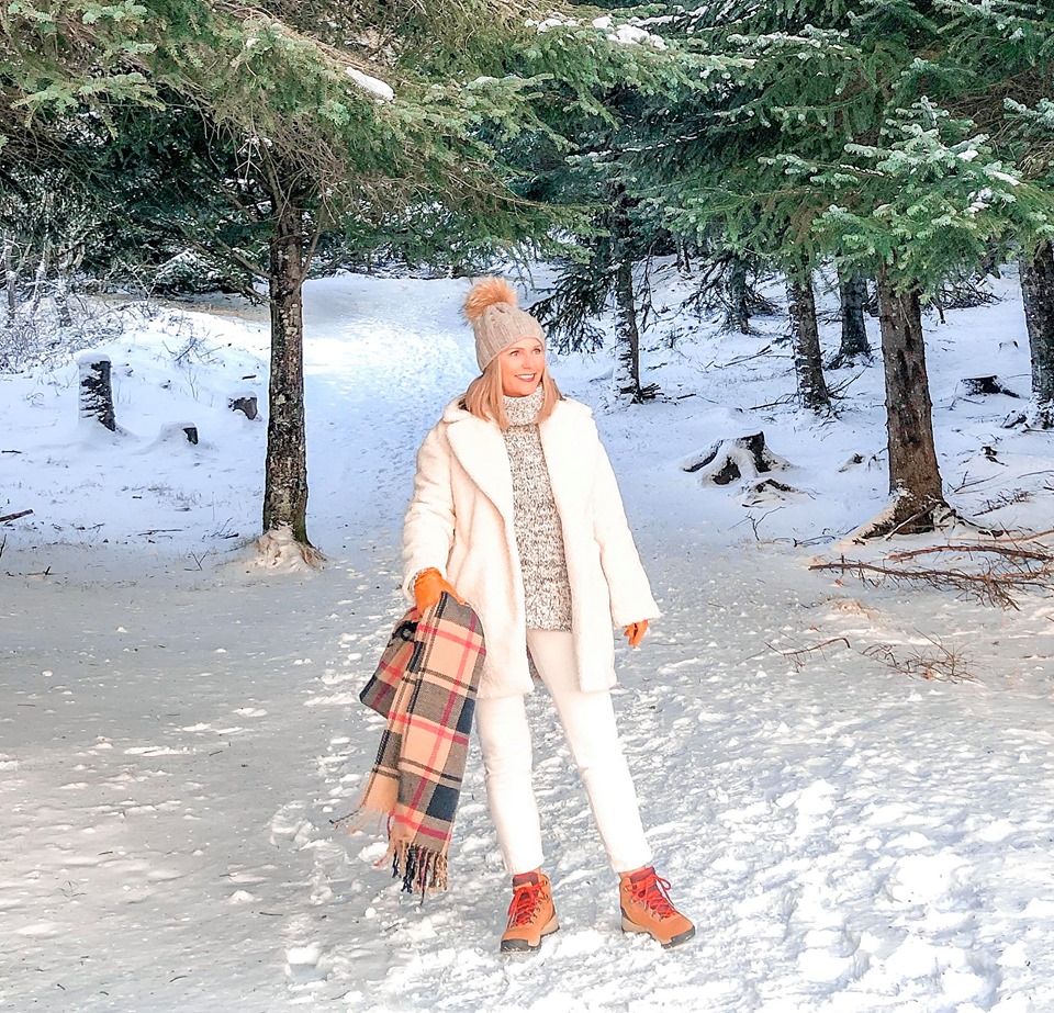 Winter white – just how beautiful are those neutrals out in the nature – well with a little bit of a red! And of course wearing a turtle neck with this cute white teddy coat.