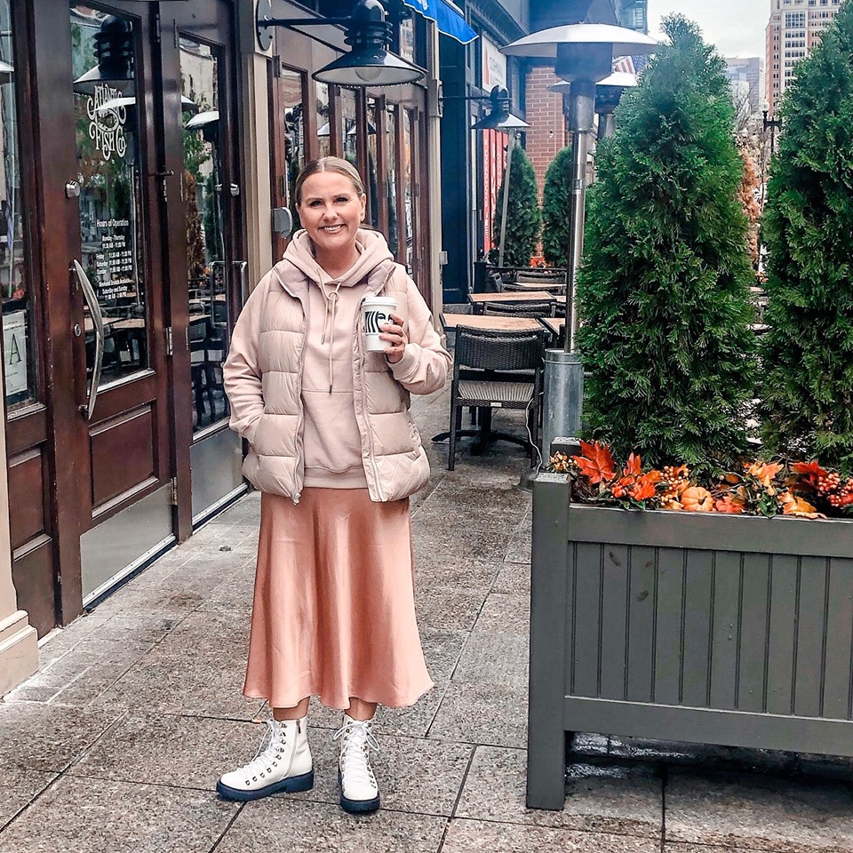 This winter hoodies have been a big part of my wardrobe, they are just so comfy. And this outfit actually shows all my favourite pieces, a hoodie, satin midi skirt, a puffer vest and big boots.